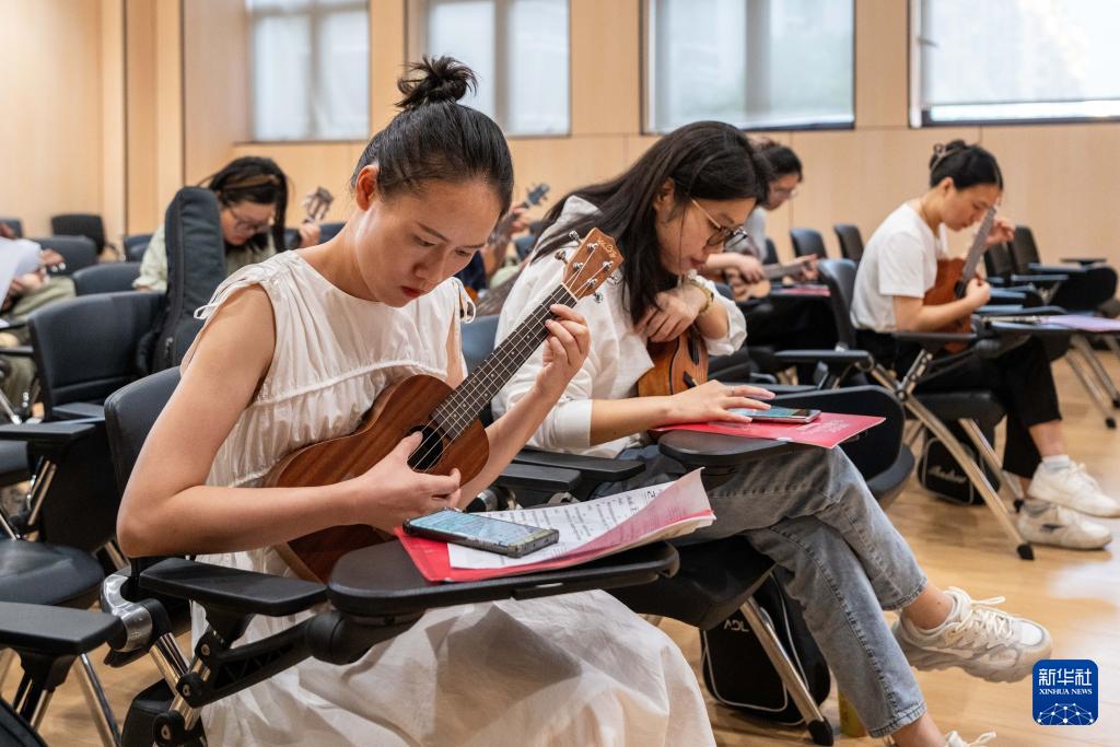 7月9日,在湖南湘江新區(qū)文化館,學(xué)員在練習(xí)尤克里里。 今年4月以來,湖南湘江新區(qū)文化館聚焦群眾對文化藝術(shù)的多元需求,開展“星光夜校”服務(wù)項(xiàng)目,設(shè)置樂器演奏、舞蹈等多種課程,滿足不同學(xué)藝需求。 新華社記者 陳思汗 攝