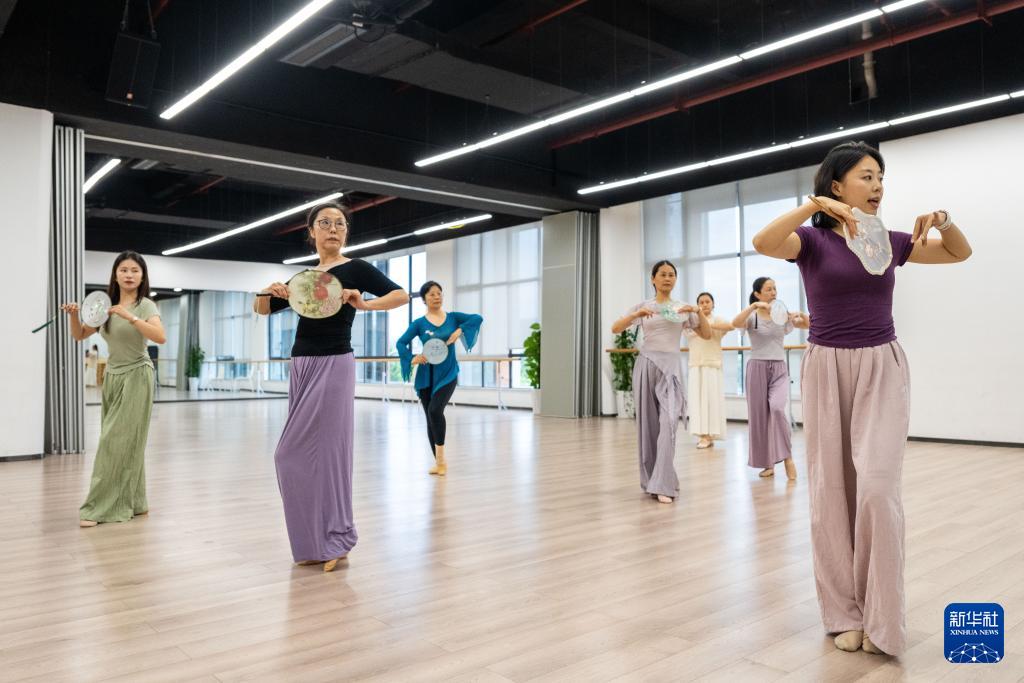 7月9日,在湖南湘江新區(qū)文化館,老師(右一)帶領(lǐng)學(xué)員練習(xí)古典舞。 今年4月以來,湖南湘江新區(qū)文化館聚焦群眾對文化藝術(shù)的多元需求,開展“星光夜?!狈?wù)項(xiàng)目,設(shè)置樂器演奏、舞蹈等多種課程,滿足不同學(xué)藝需求。 新華社記者 陳思汗 攝