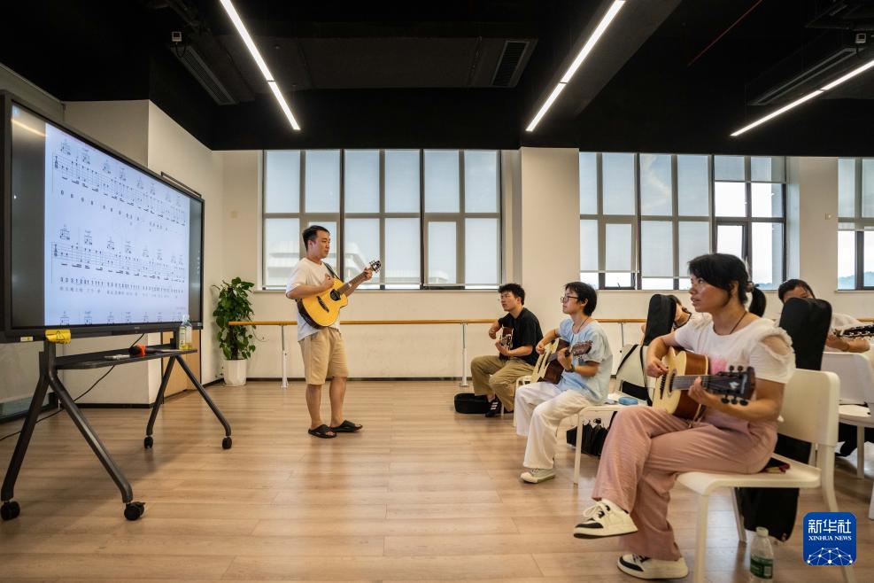 7月9日,在湖南湘江新區(qū)文化館,老師(左一)在傳授吉他演奏技巧。 今年4月以來,湖南湘江新區(qū)文化館聚焦群眾對文化藝術(shù)的多元需求,開展“星光夜校”服務(wù)項(xiàng)目,設(shè)置樂器演奏、舞蹈等多種課程,滿足不同學(xué)藝需求。 新華社記者 陳思汗 攝