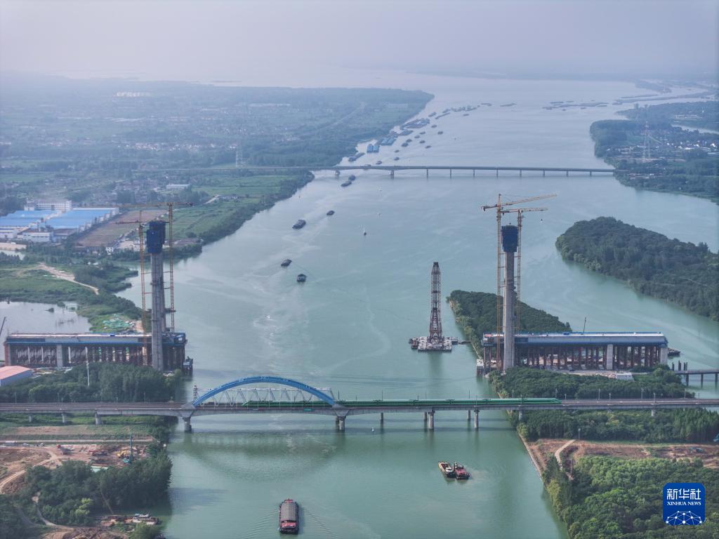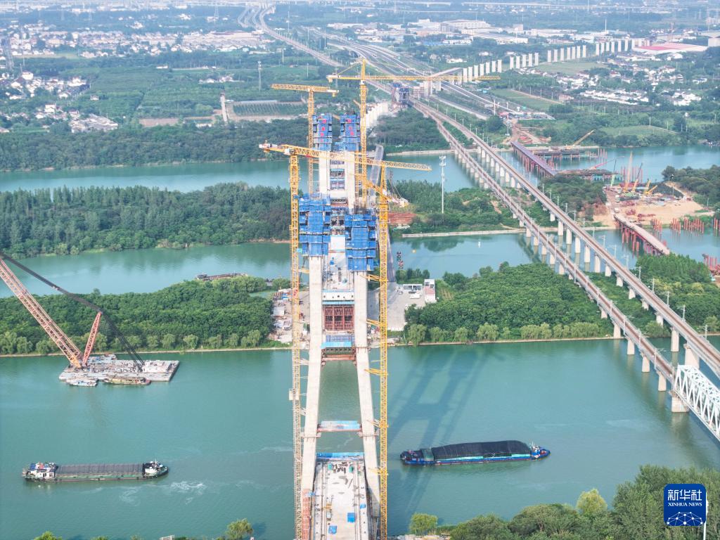 這是滬渝蓉高鐵跨京杭運河斜拉橋施工現(xiàn)場(7月13日攝,無人機照片)。 近日,由中國鐵建大橋局承建的滬渝蓉高鐵跨京杭運河斜拉橋主橋兩岸鋼混段架設(shè)順利完成,大橋主橋上部結(jié)構(gòu)施工轉(zhuǎn)入鋼梁懸臂拼裝階段,主塔建設(shè)已完成90%。據(jù)悉,該橋位于江蘇揚州境內(nèi),是滬渝蓉高鐵全線關(guān)鍵控制性工程,橋長564.3米,主跨300米。 滬渝蓉高鐵是國家“八縱八橫”高鐵骨干通道之一,線路總長約2100公里,設(shè)計時速350公里。 新華社記者 季春鵬 攝