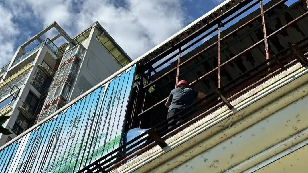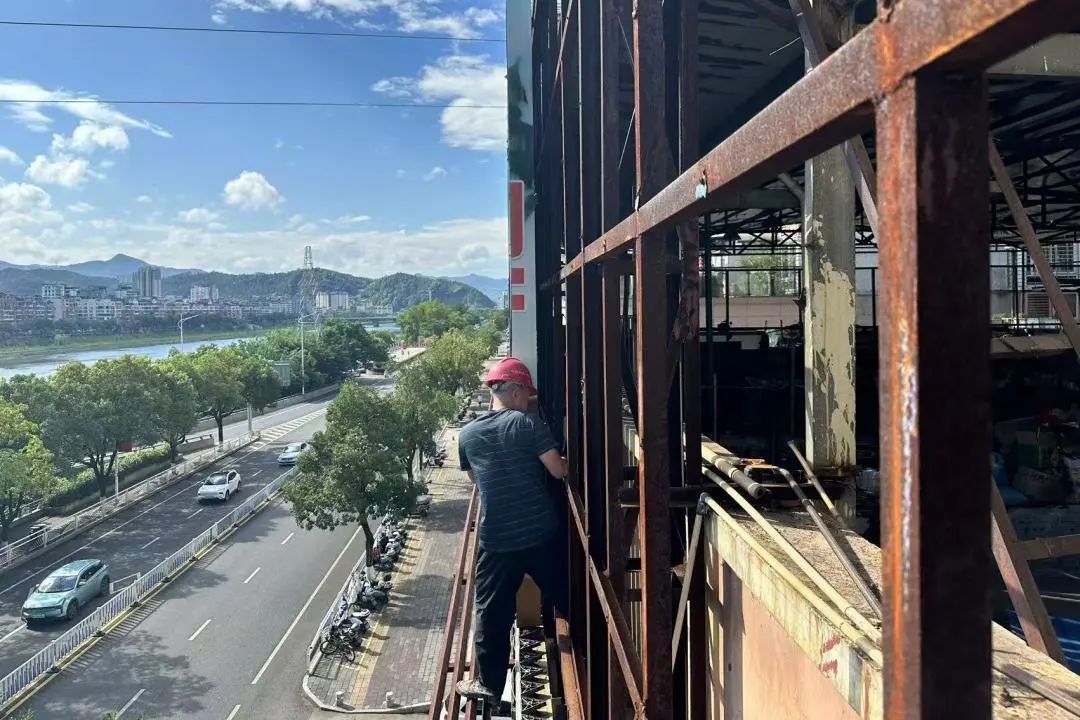 7月10日,在朱熹大道,建陽區城管局城區中隊執法隊員正在對一處存在掉落風險的大型老舊廣告牌,組織拆除作業。 該處隱患廣告牌因設置年代較早,在風吹日曬中畫布已有些許開裂,上至頂樓發現,廣告牌后部分支架銹蝕,如若遇強風等極端天氣,極易發生斷裂倒塌,對過往行人車輛構成嚴重威脅。