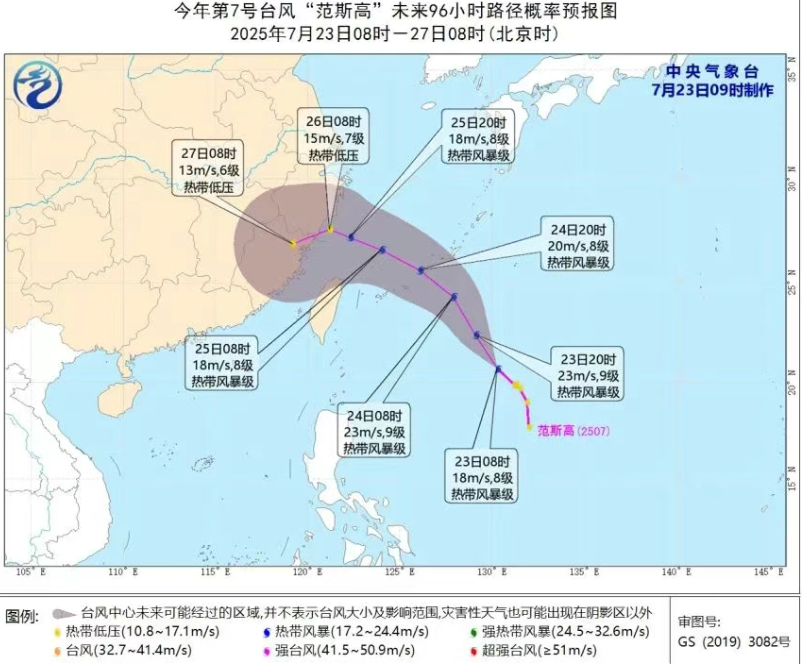 今年第7號臺風“范斯高”(熱帶風暴級;英文名稱:Francisco;名字來源:美國;名稱意義:查莫羅(Chamorro)男子名)已于7月23日上午在菲律賓以東洋面生成,上午8點鐘其中心位于浙閩交界東偏南方大約1230公里的洋面上。預計,“范斯高”將以每小時15-20公里的速度向北偏西方向移動,強度逐漸增強。24日夜間移入東海南部海面,最強可達熱帶風暴級或強熱帶風暴級(9-10級,23-25米/秒),并向浙江南部到福建北部一帶沿海靠近。
