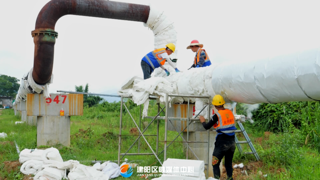 建陽經濟開發區精細化工產業園集中供熱項目(一期)總投資5000萬元,于去年年初開始施工,目前,該項目建設進度已完成近90%,計劃2026年2月前可完成項目(一期)建設。 7月22日,在建陽經濟開發區精細化工產業園集中供熱項目(一期)建設現場,幾名工人正專注地用保溫棉、防水布等材料為供熱管道包裹外保溫層,進一步防止管道熱量損耗。