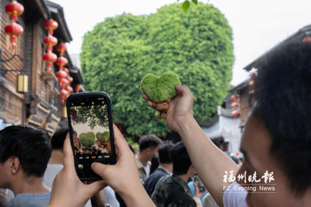 位于福州南門兜的老榕樹。記者 石美祥 攝 央視記者著重介紹了兩棵福州地標(biāo)性榕樹。第一棵榕樹位于福州市中心南門兜。因地處交通要道,這棵老榕樹被稱為地標(biāo)榕。地鐵南門兜站是福州地鐵1號(hào)線、2號(hào)線的換乘站,具有重要交通樞紐功能。為保護(hù)這棵老榕樹,設(shè)計(jì)時(shí)福州地鐵特地繞行并優(yōu)化方案,讓老榕樹免受騰挪之苦,最大程度守護(hù)城市綠意,體現(xiàn)了福州城市建設(shè)堅(jiān)持“保護(hù)優(yōu)先、不砍樹少挪樹”的原則。 第二棵榕樹是位于福州三坊七巷的愛心樹。它已成為福州文旅新晉頂流,許多游客慕名而來拍照打卡。以愛心樹為靈感設(shè)計(jì)的毛絨掛件,如今已成為福州文創(chuàng)“香餑餑”。據(jù)統(tǒng)計(jì),該掛件上線一年多來,整體銷量超27萬件。可以說,榕樹已成為福州最具特色的文化IP,為當(dāng)?shù)匚穆媒?jīng)濟(jì)發(fā)展注入新活力。