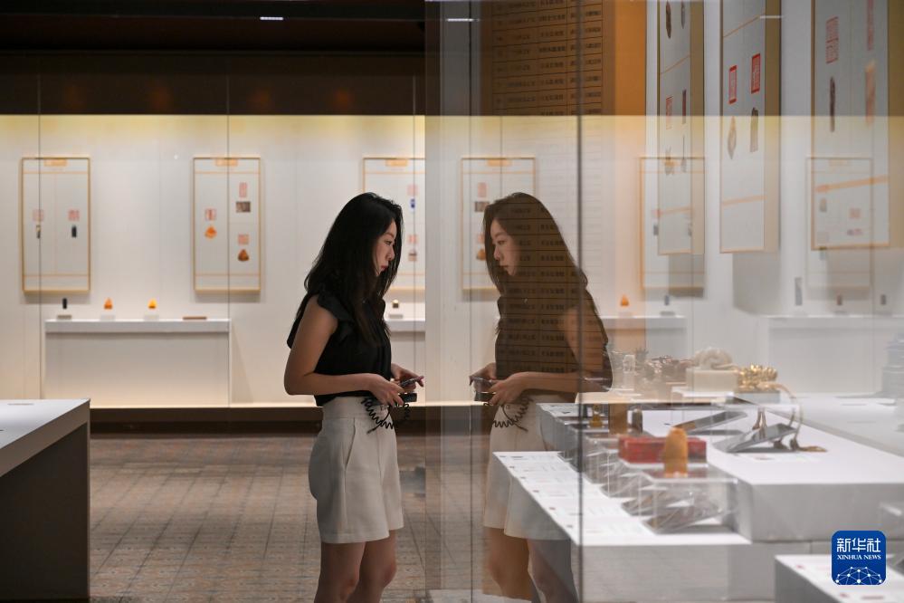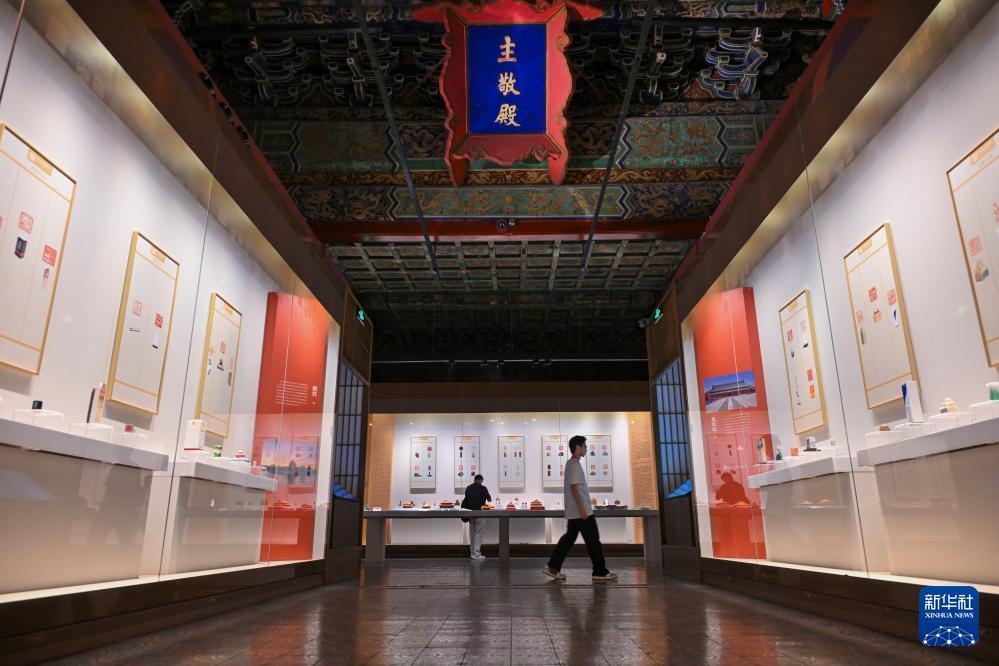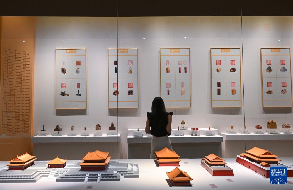 7月27日,觀眾在故宮文華殿欣賞篆刻作品展。 當日,由故宮博物院、北京京企中軸線保護公益基金會共同主辦,北京歌華文化中心有限公司承辦的“世界文化遺產北京中軸線——印記北京中軸線大眾篆刻作品展故宮站”在北京故宮博物院文華殿開幕。 展覽分為“大眾篆刻·中軸新章:人民筆下的中軸線”“故宮璽印·紫禁回響:宮廷印章中的歷史密碼”兩大板塊,主要展出200枚大眾篆刻作品與20方清代宮廷璽印。 新華社記者 金良快 攝