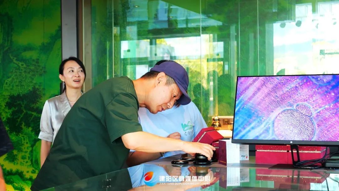 建陽區城投集團和印象大紅袍股份有限公司還合作推出了《福熹映月》聯名款建盞。此款建盞以福袋為形,凝武夷暮色之紫曜;盞內星斑浮沉,似茶湯化九曲明月清輝。 入駐企業負責人潘賢森:“它的底托有‘月映武夷’的一個標志,還有我們‘中國建窯·世界建盞’的字樣,讓它更有收藏珍藏紀念的意義。”
