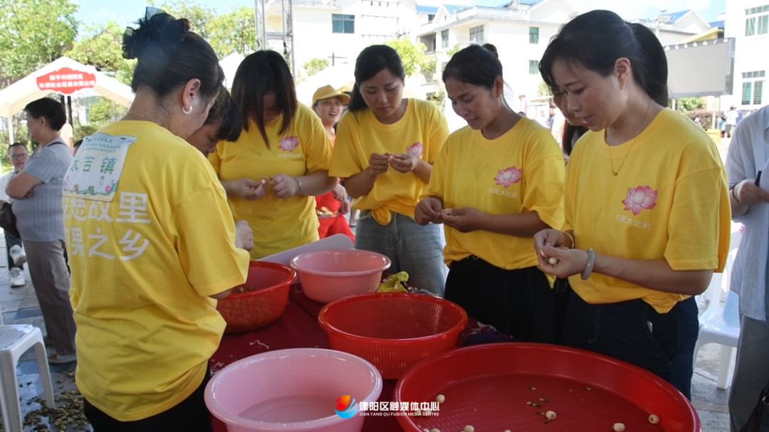 隨后開展第五屆宋慈白蓮手工制作大比武,水吉鎮、小湖鎮、書坊鄉及崇雒鄉各村、社區共十支代表隊參賽,參賽隊員們各顯身手,分工協作,配合默契,剝殼、去皮、通芯,動作行云流水、一氣呵成。