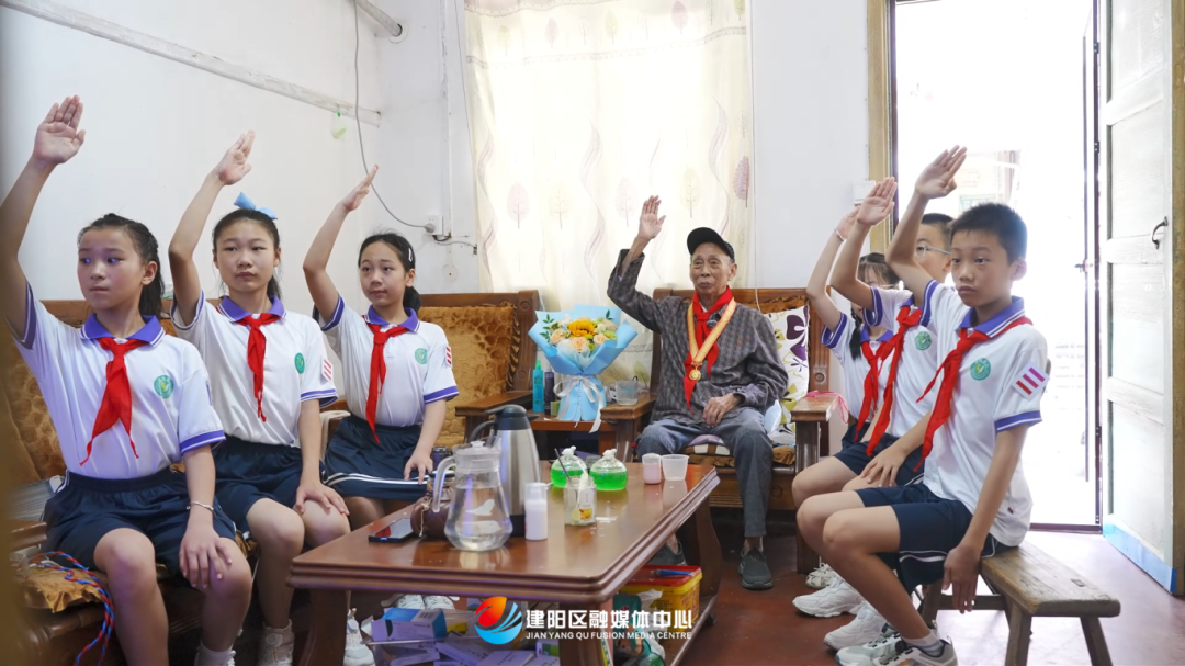 9月3日,紀念中國人民抗日戰爭暨世界反法西斯戰爭勝利80周年大會在北京天安門廣場隆重舉行。我區社會各界干部群眾懷著無比激動的心情,紛紛通過收聽收看實況直播的方式,共同銘記歷史、緬懷先烈、珍愛和平、開創未來。 當天上午,家住西橋新村的99歲抗戰老兵藍自斌,早早佩戴好“中國人民抗日戰爭勝利80周年”紀念章,坐在電視機前,與前來探望的建師附小學生一同收看直播。