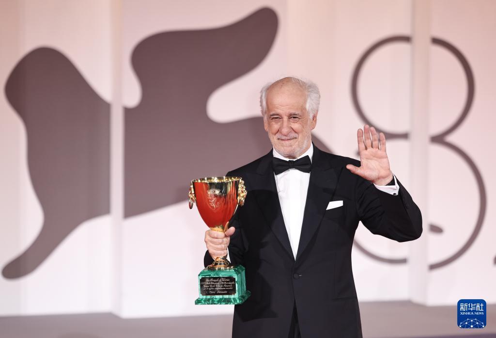 9月6日,在意大利威尼斯,最佳男演員獎(jiǎng)獲得者、電影《恩典》演員托尼·瑟維洛與獎(jiǎng)杯合影。 第82屆威尼斯國(guó)際電影節(jié)6日晚在意大利水城威尼斯的利多島落下帷幕。 新華社記者 李京