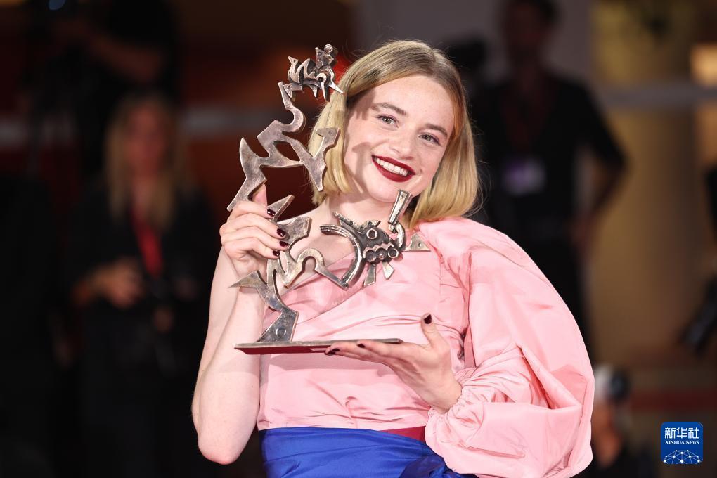 9月6日,在意大利威尼斯,最佳新演員獎(jiǎng)獲得者、電影《寂靜的朋友》演員盧娜·韋德勒與獎(jiǎng)杯合影。 第82屆威尼斯國(guó)際電影節(jié)6日晚在意大利水城威尼斯的利多島落下帷幕。 新華社記者 李京 攝