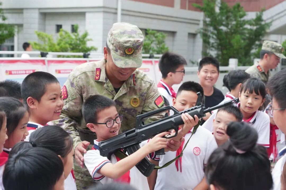 學(xué)生們觀察蛟龍?zhí)柗抡婺P汀〔糖咤z 當(dāng)天,建陽(yáng)區(qū)推出“強(qiáng)國(guó)興軍 礪劍鑄盾”全民國(guó)防教育移動(dòng)展館巡展,為該校師生帶來(lái)一場(chǎng)沉浸式國(guó)防教育課。 這個(gè)“移動(dòng)展館”由100面可移動(dòng)展板和20件仿真軍事模型搭建而成。展板上,十大英模的光輝事跡、軍事裝備的圖文介紹、通俗化解讀的《國(guó)防法》等法規(guī)內(nèi)容依次鋪開(kāi),讓孩子們看懂“英雄分量”與國(guó)防知識(shí)。 模型區(qū)的展桌被孩子們圍得水泄不通,透過(guò)玻璃罩,能看清“遼寧艦(舷號(hào)-16)”甲板上的每一架戰(zhàn)斗機(jī)。99式主戰(zhàn)坦克模型的履帶摸起來(lái)凹凸分明,紅旗17A防空導(dǎo)彈車模型的雷達(dá)和炮塔還能靈活轉(zhuǎn)動(dòng)。在民兵的指導(dǎo)下,孩子們輪番把塑鋼材質(zhì)的95-1式步槍模型抵在肩窩,有模有樣地學(xué)習(xí)。