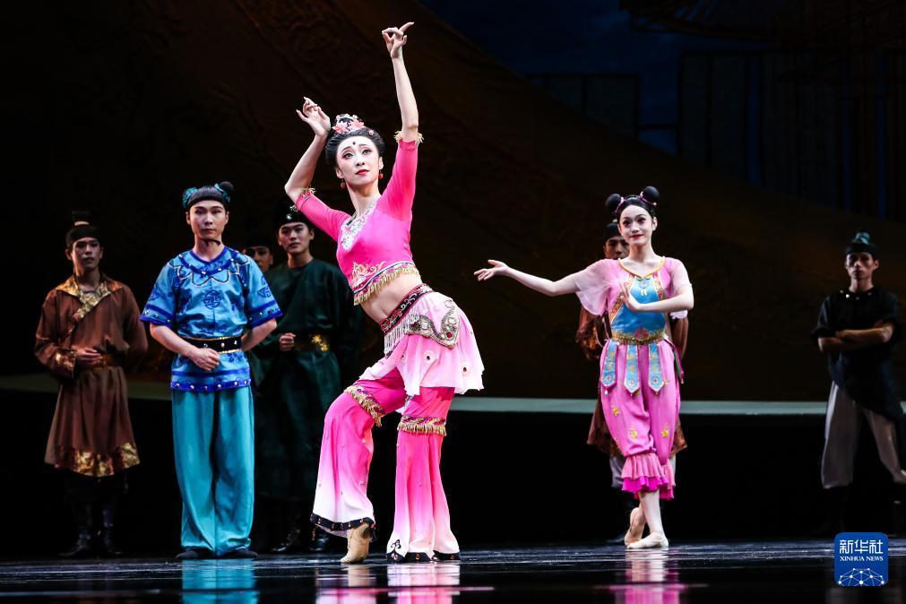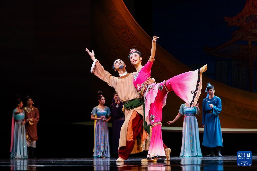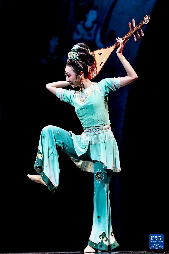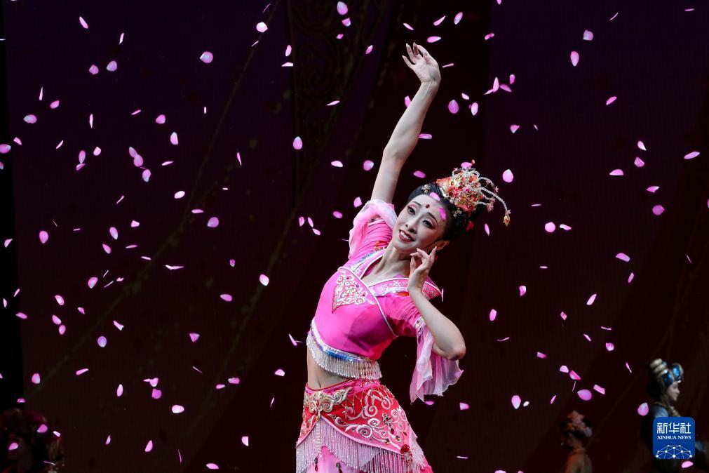9月20日晚,演員在敦煌大劇院表演新版《絲路花雨》,展示經典舞姿“反彈琵琶”。 9月20日至22日,第八屆絲綢之路(敦煌)國際文化博覽會在甘肅省敦煌市舉行。敦煌文博會期間,新版《絲路花雨》精彩亮相敦煌大劇院,為與會嘉賓帶來一場穿越千年的文化盛宴。 1979年,大型民族舞劇《絲路花雨》在中國西北誕生。編創者們從敦煌莫高窟的壁畫和彩塑中尋找靈感,將千年前的文化瑰寶編排成動人心弦的舞臺作品。40多年來,《絲路花雨》累計演出超4000場。此次新版歷經兩年半創排,通過復原與創新對經典藝術進行當代詮釋,彰顯了中華優秀傳統文化的生命力。 新華社記者 郎兵兵 攝