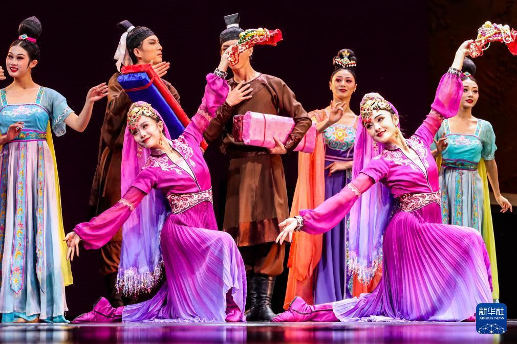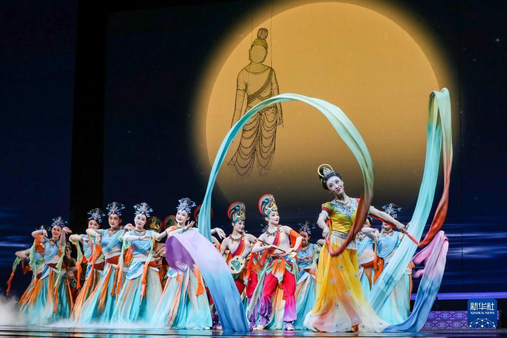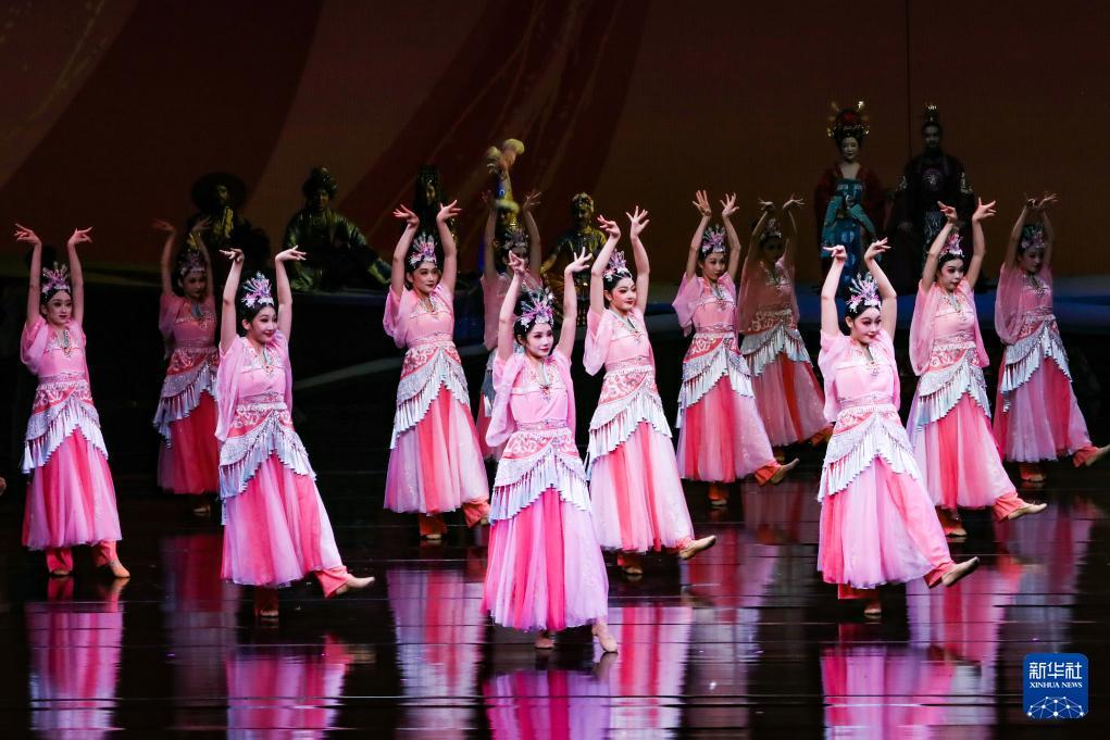 9月20日晚,演員在敦煌大劇院表演新版《絲路花雨》。 9月20日至22日,第八屆絲綢之路(敦煌)國際文化博覽會在甘肅省敦煌市舉行。敦煌文博會期間,新版《絲路花雨》精彩亮相敦煌大劇院,為與會嘉賓帶來一場穿越千年的文化盛宴。 1979年,大型民族舞劇《絲路花雨》在中國西北誕生。編創者們從敦煌莫高窟的壁畫和彩塑中尋找靈感,將千年前的文化瑰寶編排成動人心弦的舞臺作品。40多年來,《絲路花雨》累計演出超4000場。此次新版歷經兩年半創排,通過復原與創新對經典藝術進行當代詮釋,彰顯了中華優秀傳統文化的生命力。 新華社記者 郎兵兵 攝