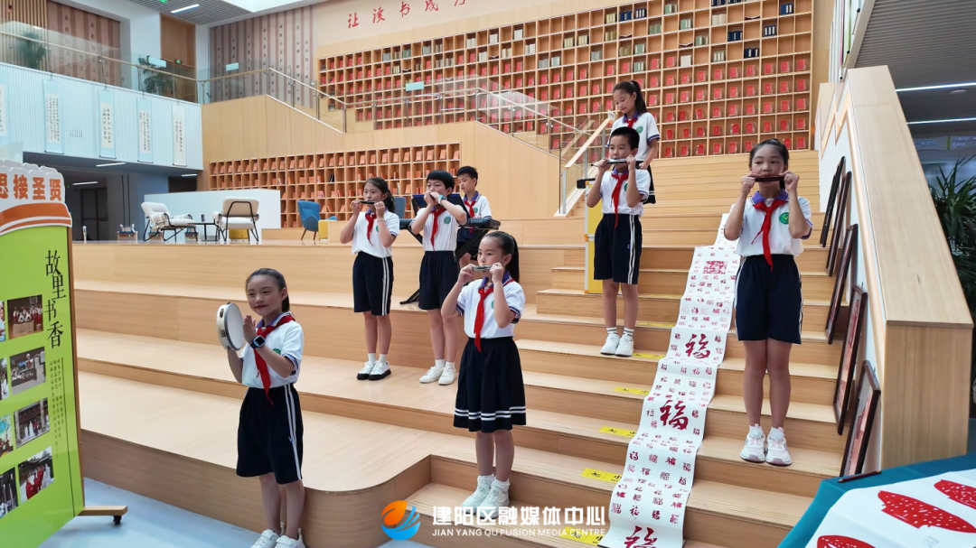 建師附小學生張晨欣:“我借鑒了建本的排版與建本圖文結合的方式,來提煉出了四大板塊,分別是經典人物、讀后感、經典故事和整本書簡介,再以建本的方式將文字一筆一劃的寫了上去。我更加體會到了建本文化與閱讀和知識傳播的快樂。” 展覽現場,來自建師附小的口琴合奏《祖國祖國我們愛你》尤為吸睛,生動呈現了建師附小在建本文化傳承創新與全學科閱讀領域的探索成果。