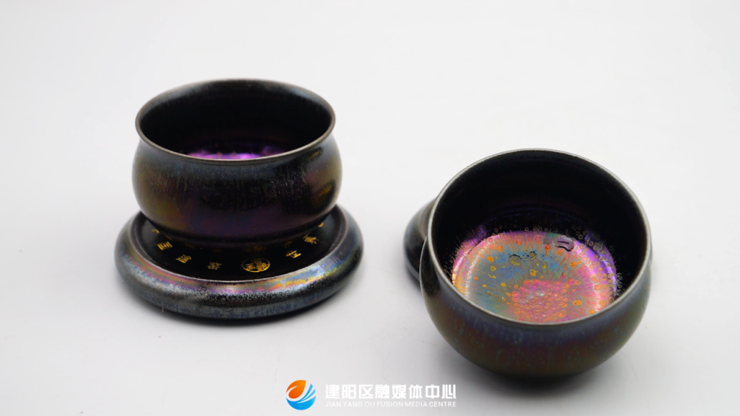 建窯建盞制作技藝市級代表性傳承人潘賢森:“我們是采用建窯建盞傳統的燒制技藝,在燒制紫氣東來的曜變彩釉滴的一個釉色,在底托配上福袋的盞型。‘熹’就是朱子文化,‘福’就是福建的‘福’文化。” 潘盞柜建盞陶瓷有限公司自成立以來,始終堅持在傳承中創新,在創新中發展的理念,研發的作品迎合市場需求,深受廣大盞友的喜愛。