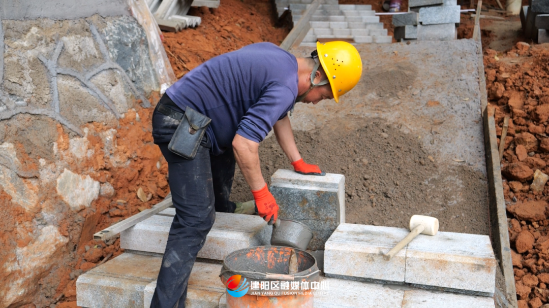 10月14日,在項目施工現場,工人們正有序開展轉運土方、石材鋪貼及清理現場垃圾等工作。