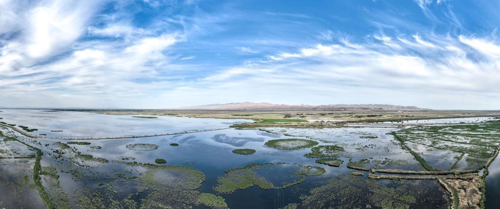 △位于內蒙古巴彥淖爾市烏拉特前旗的烏梁素海 內蒙古巴彥淖爾烏梁素海,是黃河流域最大的湖泊濕地,一度因接納過多農田退水、生活污水與工業廢水,水質嚴重下降。 如今,這片“塞外明珠”藍天碧水,飛鳥翔集。 2023年6月,習近平總書記來到巴彥淖爾,用兩個半天時間,看齊了湖、田、林、沙、水。在隨后主持召開的加強荒漠化綜合防治和推進“三北”等重點生態工程建設座談會上,總書記進一步強調要“堅持山水林田湖草沙一體化保護和系統治理”。 如今,寧夏中衛市沙坡頭區長流水村最后50米草方格扎進濕沙層,寧夏境內騰格里沙漠已鑲上“綠鏈”;塔克拉瑪干沙漠邊緣空白區也實現了鎖邊“合龍”,形成全長3046公里、世界最長的環沙漠生態屏障。