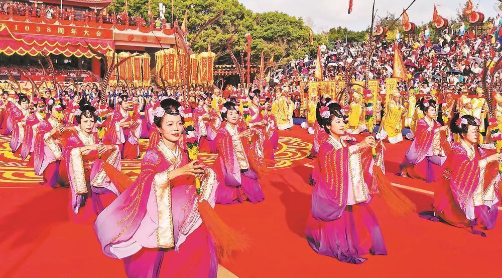10月29日至31日,莆田湄洲媽祖祖廟旌旗飄揚、鼓樂喧天、人潮涌動,紀念媽祖羽化升天1038周年暨媽祖金身巡安湄洲島系列活動在此舉行,兩岸5000多名信眾聚首湄洲島,同謁媽祖、共襄盛會。圖為開幕式現場。 福建日報報業集團記者 陳盛鐘 通訊員 程黎婷 林春盛 林鵬 攝影報道