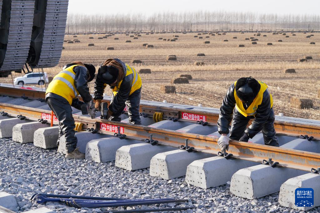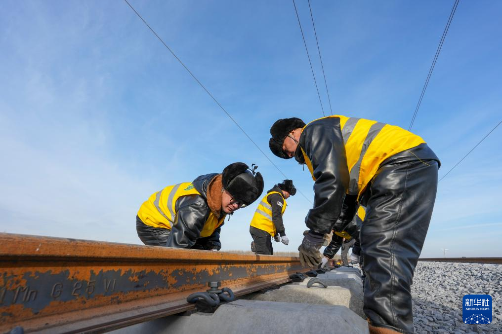 11月25日,工人在黑龍江省綏化市慶安縣永華村哈伊高鐵哈鐵段鋪軌現(xiàn)場工作。 11月25日,在黑龍江省綏化市慶安縣永華村哈伊高鐵哈鐵段鋪軌現(xiàn)場,施工方中鐵二局的四名工人手持電動扳手,將最后一對鋼軌螺栓擰緊,標(biāo)志著我國"十四五"重點(diǎn)工程哈伊高鐵全線鋪軌貫通,為后續(xù)聯(lián)調(diào)聯(lián)試奠定基礎(chǔ)。 據(jù)了解,哈伊高鐵于2024年5月28日正式啟動鋪軌,是我國"八縱八橫"高鐵網(wǎng)京哈—京港澳通道的重要延伸,也是在建緯度最高、全年溫差最大,且首條穿越多年島狀凍土區(qū)的高速鐵路。 新華社記者 王松 攝