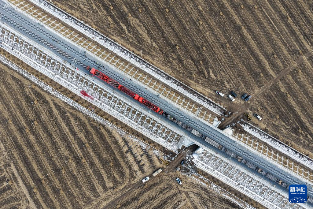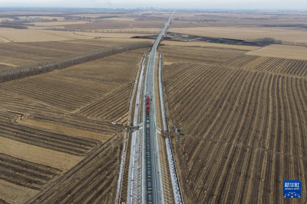這是11月25日在黑龍江省綏化市慶安縣永華村拍攝的哈伊高鐵哈鐵段鋪軌現(xiàn)場(無人機(jī)照片)。 11月25日,在黑龍江省綏化市慶安縣永華村哈伊高鐵哈鐵段鋪軌現(xiàn)場,施工方中鐵二局的四名工人手持電動扳手,將最后一對鋼軌螺栓擰緊,標(biāo)志著我國"十四五"重點(diǎn)工程哈伊高鐵全線鋪軌貫通,為后續(xù)聯(lián)調(diào)聯(lián)試奠定基礎(chǔ)。 據(jù)了解,哈伊高鐵于2024年5月28日正式啟動鋪軌,是我國"八縱八橫"高鐵網(wǎng)京哈—京港澳通道的重要延伸,也是在建緯度最高、全年溫差最大,且首條穿越多年島狀凍土區(qū)的高速鐵路。 新華社記者 王松 攝