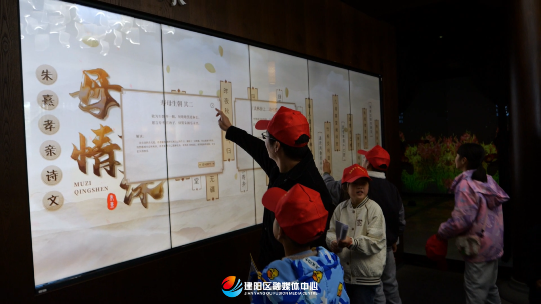 冬陽和煦,青瓦靜謐。在寒泉精舍古韻盎然的院落里,來自旭輝學校的15組親子家庭正跟隨社工,傾聽朱熹與母親之間的家風故事。展陳區前,爸爸們俯身牽起孩子的手,一同觸摸光影交織的文化脈絡,在傳統與現代的融合中,悄然拉近了親子間的距離。