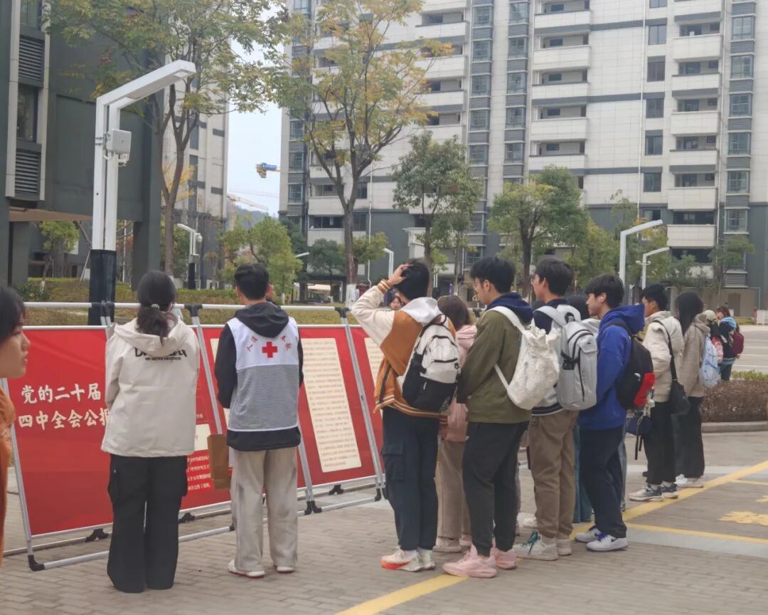 來(lái)往學(xué)生駐足觀看黨的二十屆四中全會(huì)精神宣傳展板