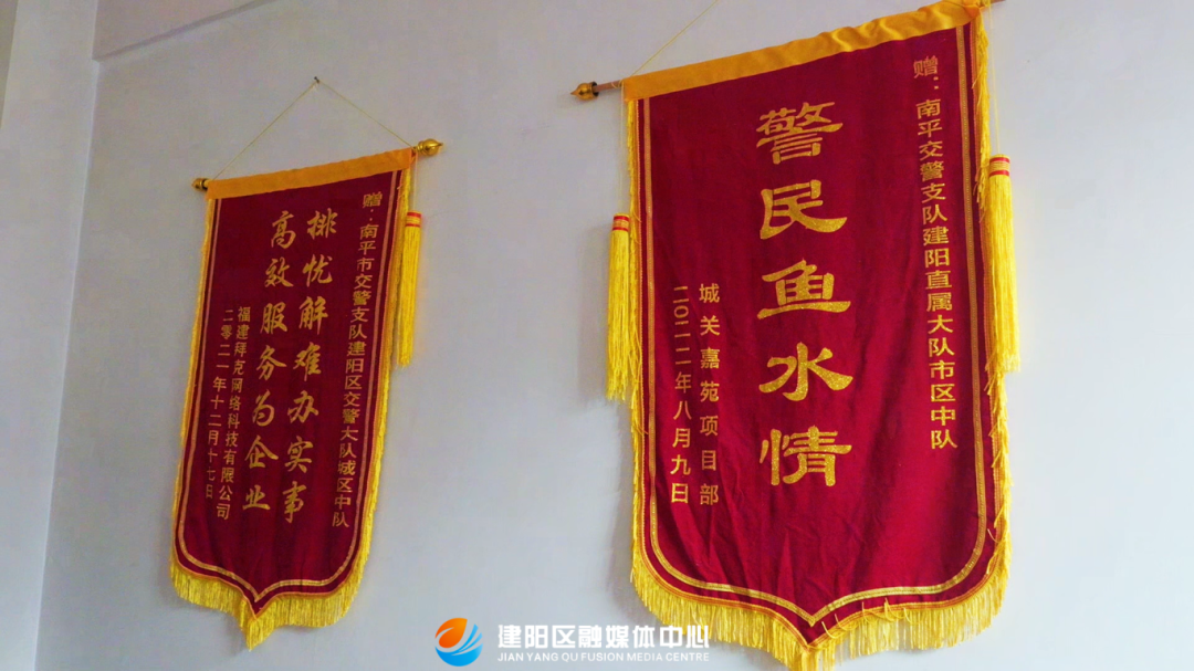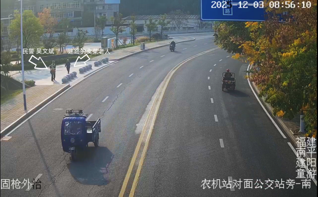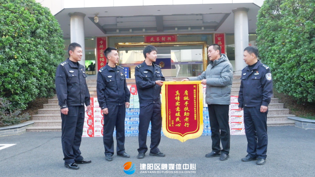 監控畫面 南平市公安局交通管理支隊建陽大隊四級警長吳文斌:“早上8點半左右,我在路口執勤,就看到有一位老人家背了兩大筐菜,很迷茫的站在那。我就過去問她是否需要幫助,她說要送去童游農貿市場,但是迷路了。我剛好在五福橋路口執勤,就背上她的扁擔,我一路把老人送到童游農貿市場。” 這段約15分鐘的路程,被路過的市民看在眼里。他用手機記錄下了吳文斌挑扁擔、扶老人的身影。隔天下午,他帶著一面精心制作的錦旗來到市公安局交通管理支隊建陽大隊。錦旗上寫著“肩挑手扶助老行 真情實意暖民心”十四個金色大字。
