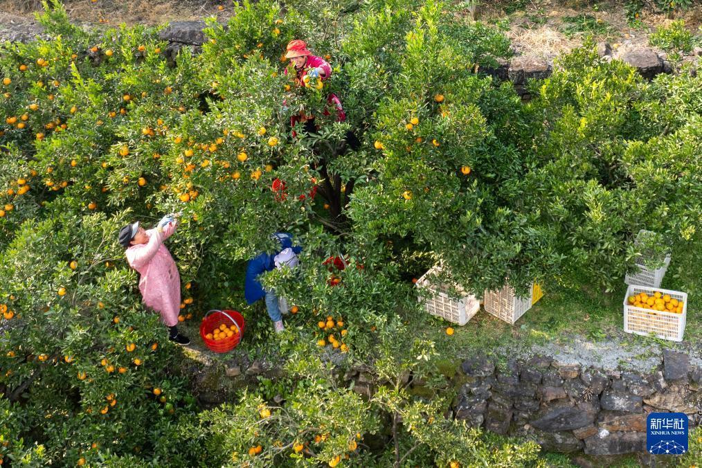 12月11日,在湖北省宜昌市長陽土家族自治縣漁峽口鎮巖松坪村,村民在采摘清江椪柑(無人機照片)。 近日,湖北省宜昌市長陽土家族自治縣漁峽口鎮的清江椪柑進入采銷旺季。2024年,全縣清江椪柑種植規模達7萬畝,年產值約5億元。產品銷往全國29個省市,并出口到馬來西亞、加拿大、西亞等國家和地區。清江椪柑已成為當地鄉村振興戰略的支柱產業。 新華社記者 杜子璇 攝
