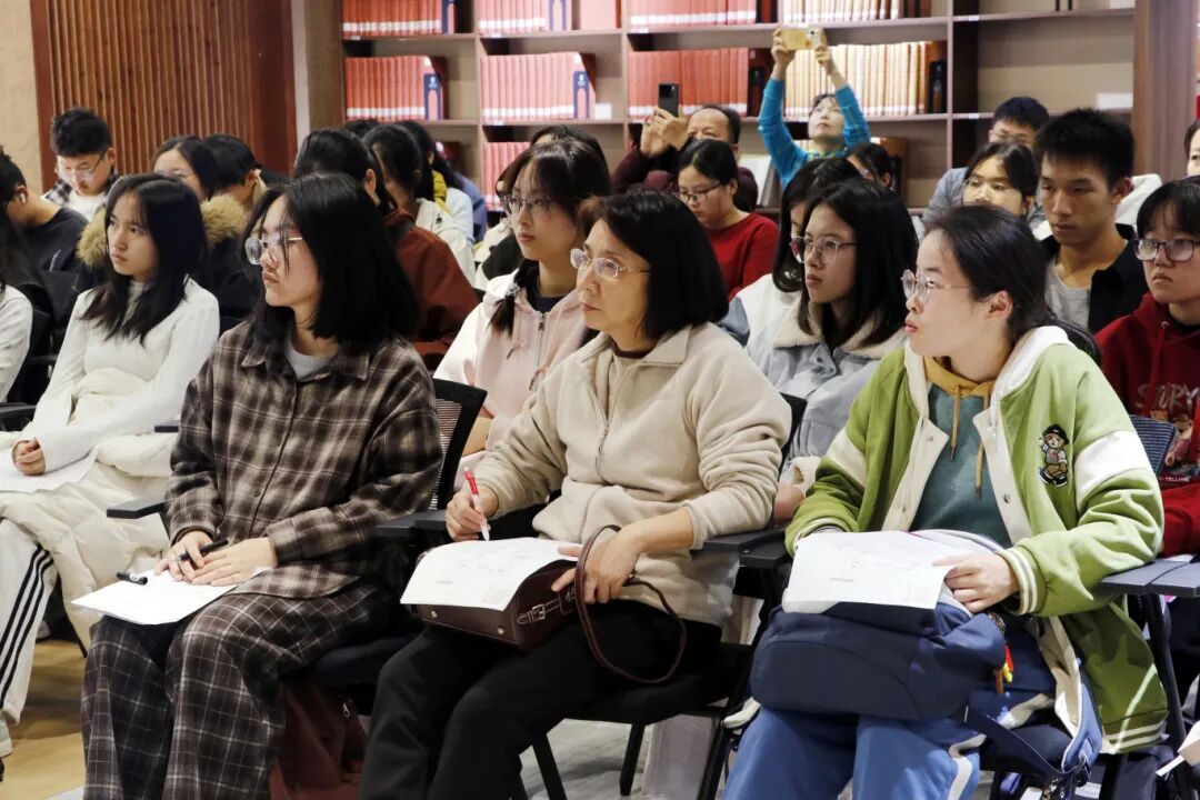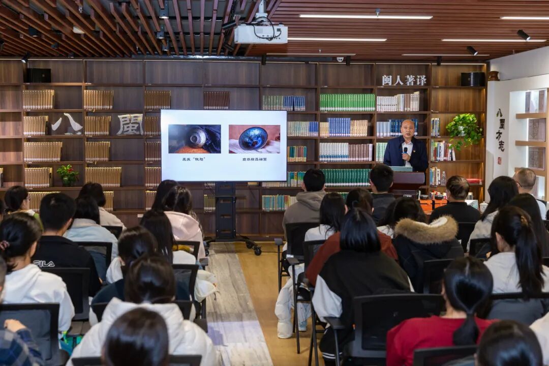 講座現場有不少年輕面孔 黃氏父子的守正創新之路 隨著朝代更迭,建盞一度沒落,近現代復興是匠人接力的結果。黃美金自1997年發現殘片,歷經上千次試驗,于2007年成功復燒“金油滴盞”,作品屢獲國內外大獎。黃文勇則攻克七彩曜變燒制奧秘,與父親一同創新傳統器型,在束口盞中加入“鉗束線”設計,優化持感,并創作星云缽、福祿瓶等新器型,拓展建盞應用場景。黃氏父子還通過“非遺”進高校、品牌化產業化運營、構建傳承人體系等方式,推動建盞傳承發展。 本場講座吸引了高校師生、文化愛好者、市民讀者百余人前來聆聽。“八閩書房”內配套展出了黃美金、黃文勇的多件建盞作品,讓讀者在講座之余得以一飽眼福,進一步感受建盞的器物之美和其中凝結的巧思匠心,增強對于保護與傳承這份珍貴文化遺產的共識與熱情。